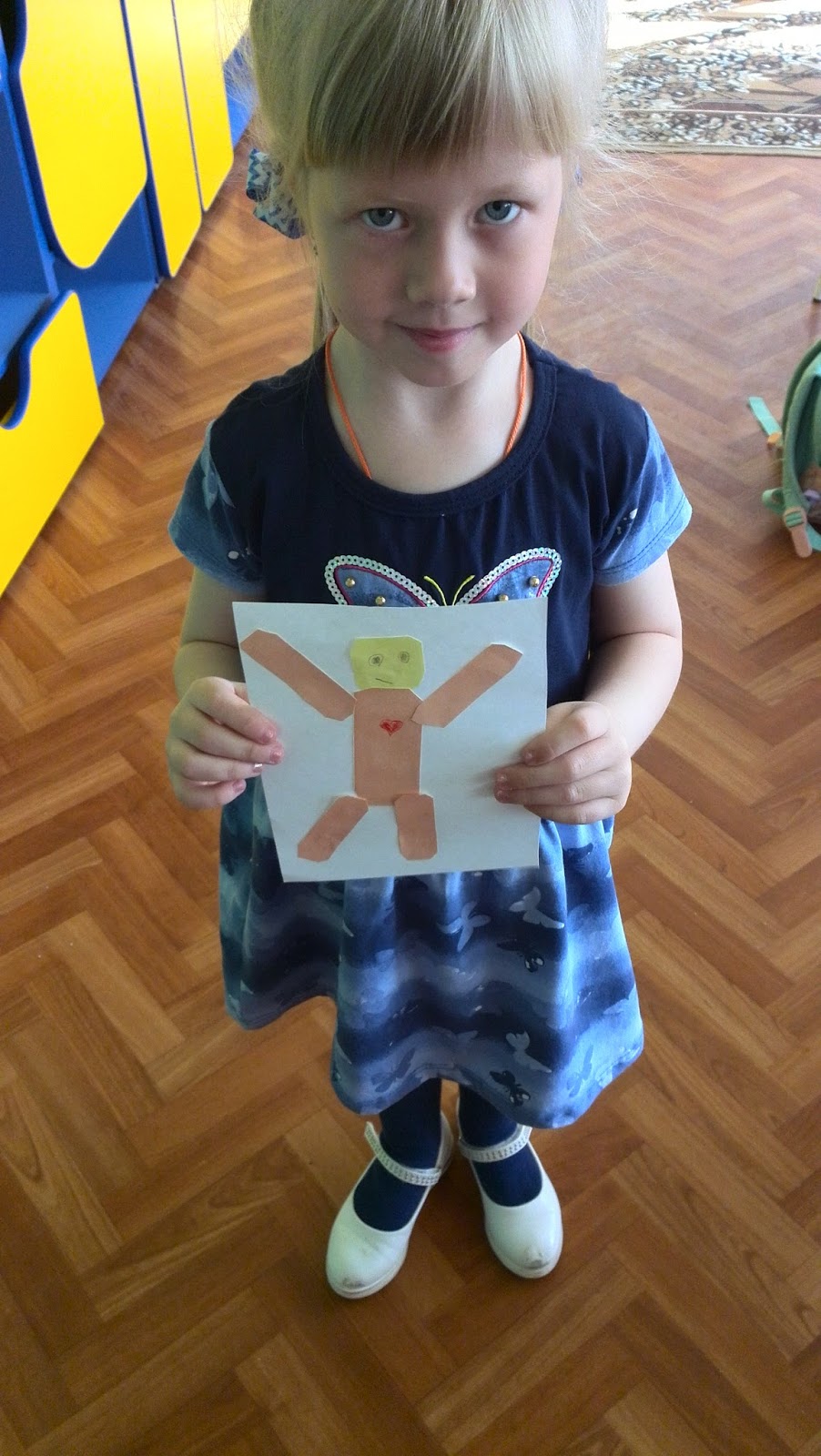 Из имеющихся заготовок прямоугольников и квадрата дети вырезали руки, ноги, туловище и голову.